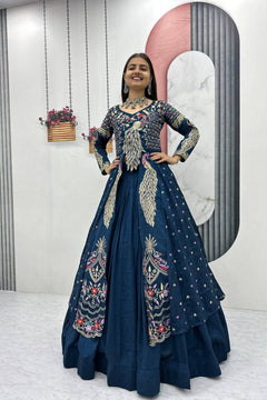Step into majestic elegance with this gorgeous Indigo Lehenga Set, featuring a designer crop top, full-flare lehenga, and heavily embroidered shrug. Crafted from luxurious Pure Vichitra fabric, this outfit blends contemporary glamour with rich traditional detailing — perfect for weddings, receptions, sangeet nights & festive events.